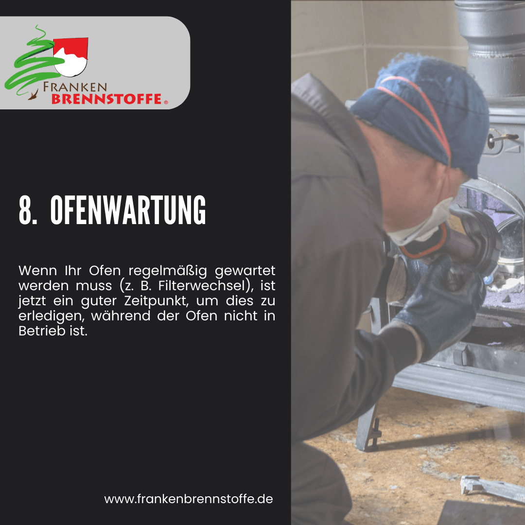 Indem Sie diese Schritte befolgen, können Sie sicherstellen, dass Ihr Ofen gut gewartet ist und bereit für die nächste Heizsaison ist. Dies hilft nicht nur, die Lebensdauer Ihres Ofens zu verlängern, sondern auch die Sicherheit zu gewährleisten und potenzielle Probleme frühzeitig zu erkennen.