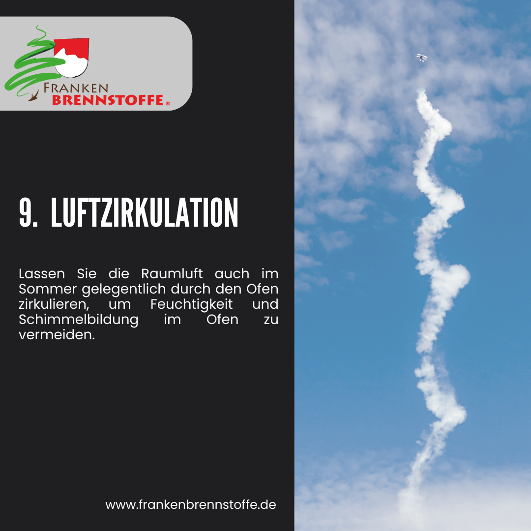 Lassen Sie die Raumluft auch im Sommer gelegentlich durch den Ofen zirkulieren, um Feuchtigkeit und Schimmelbildung im Ofen zu vermeiden.